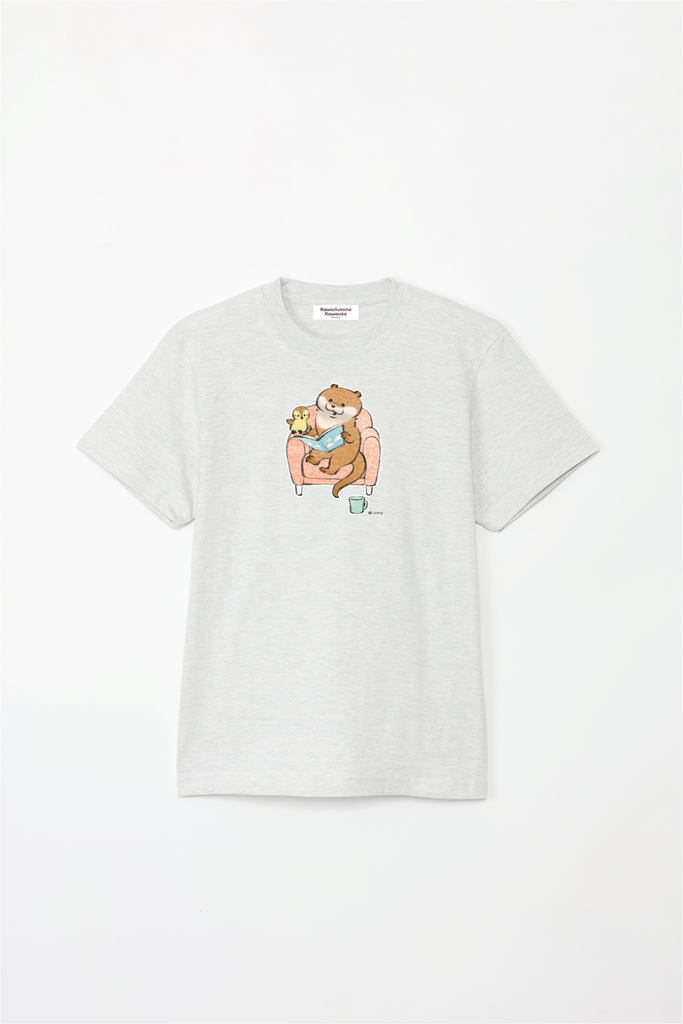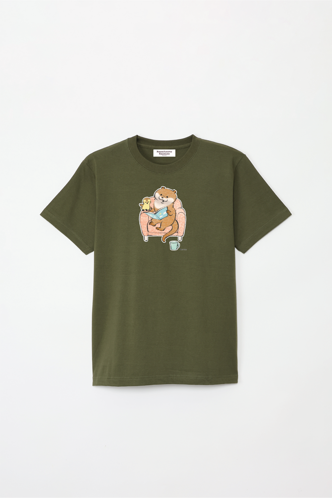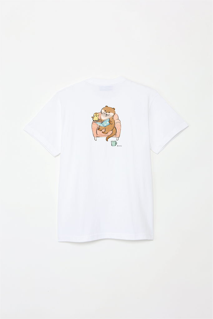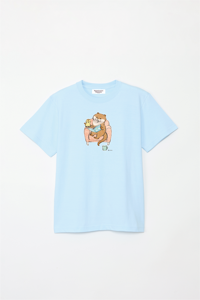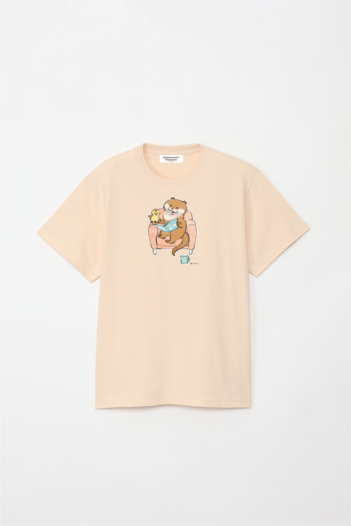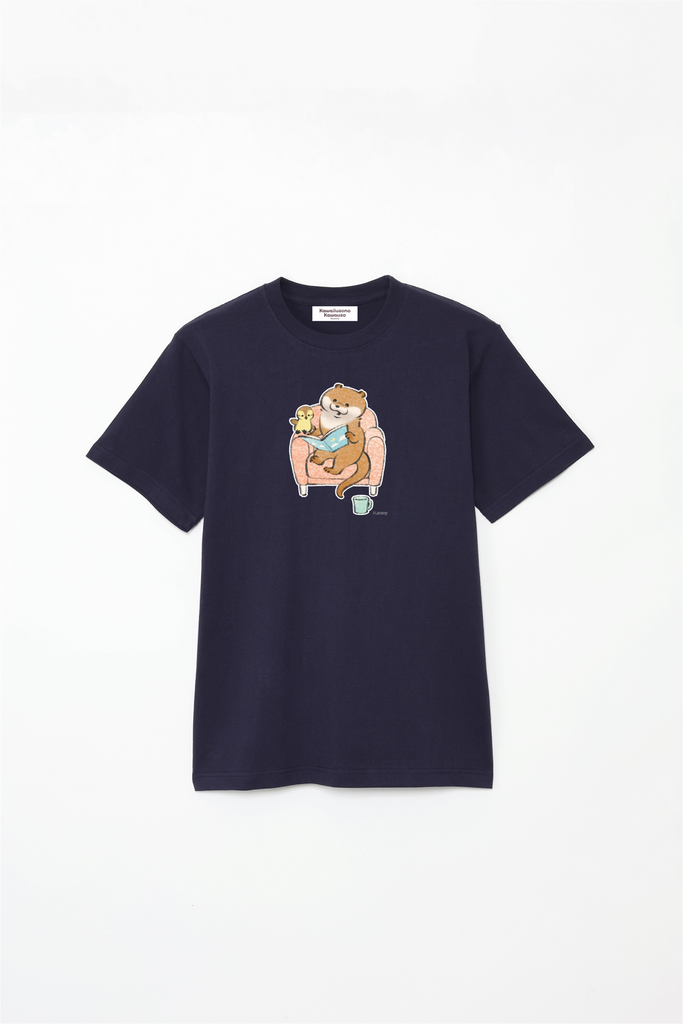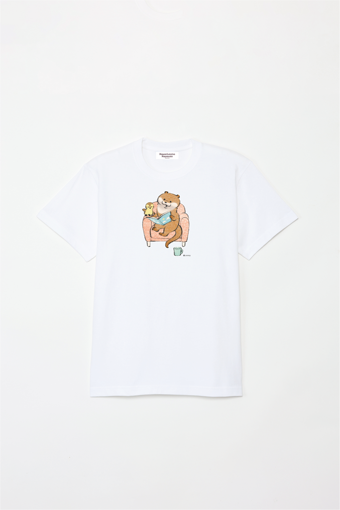 ソファで本を読むカワウソとカモちゃんの可愛いデザイン