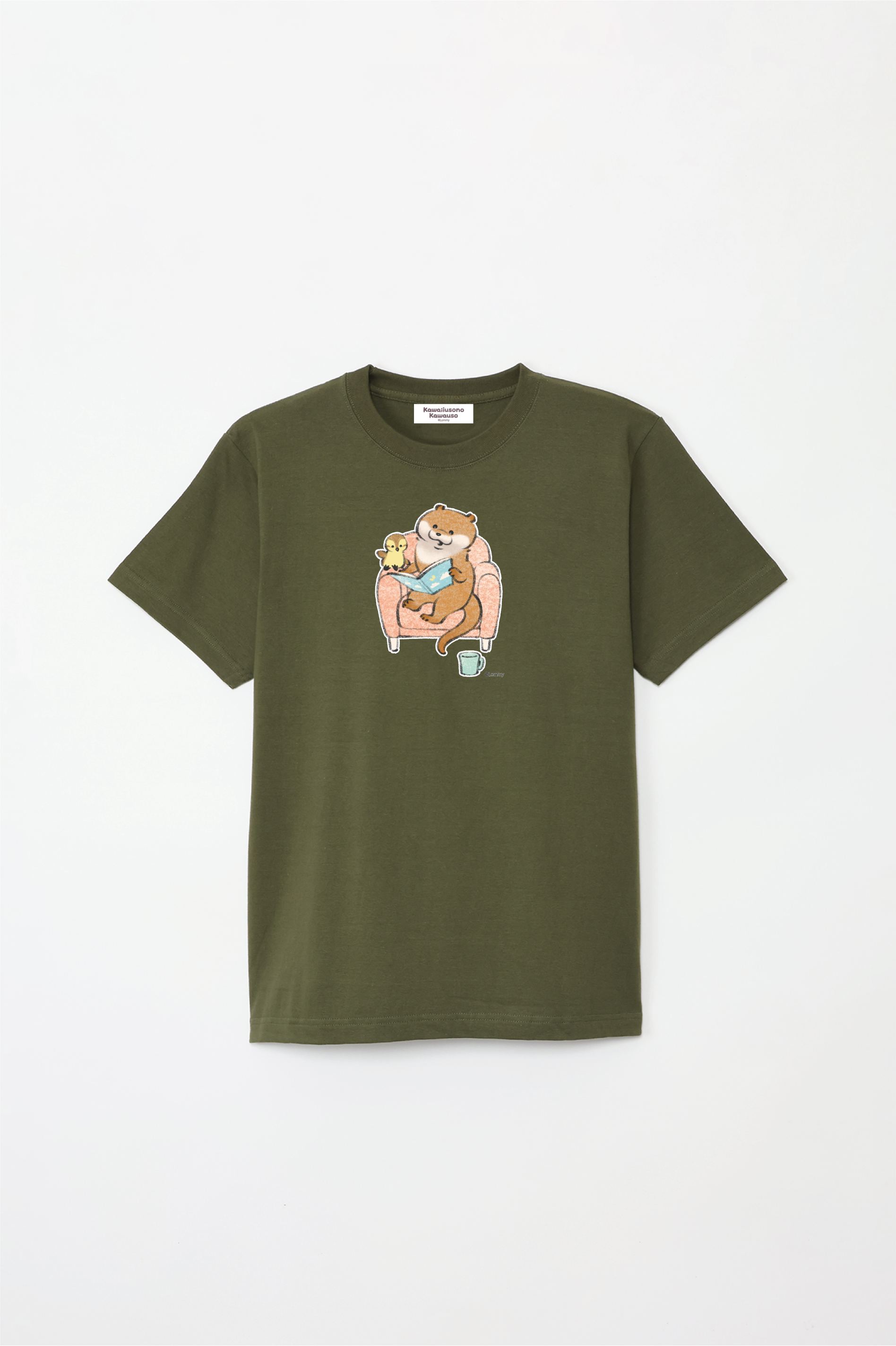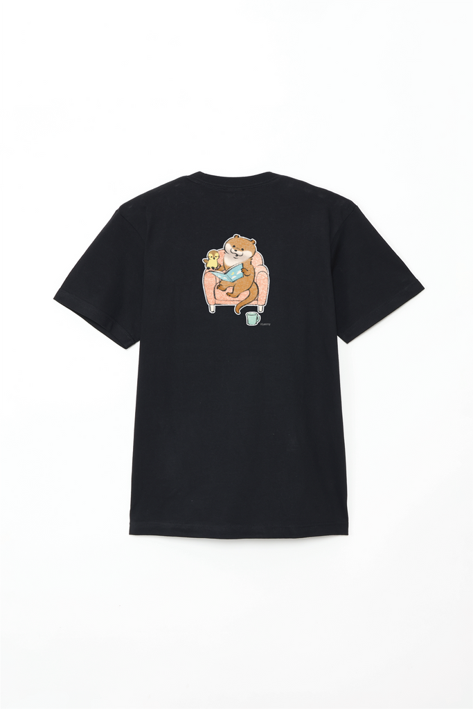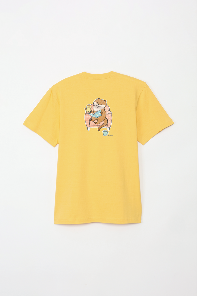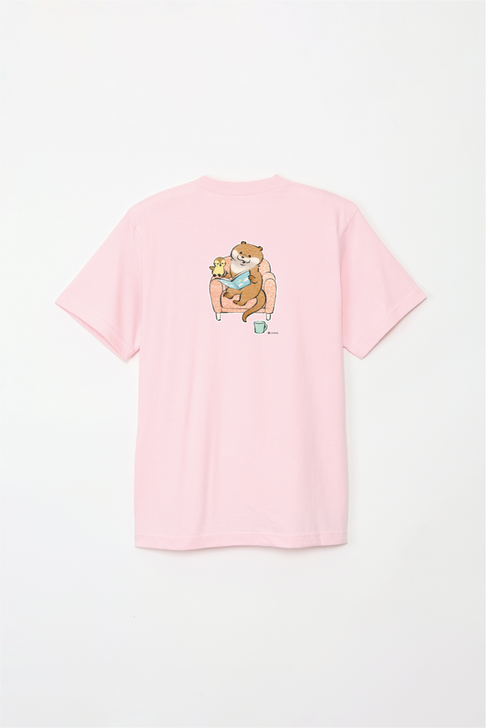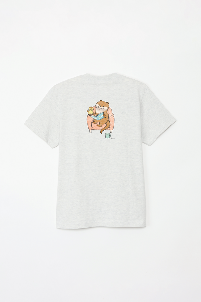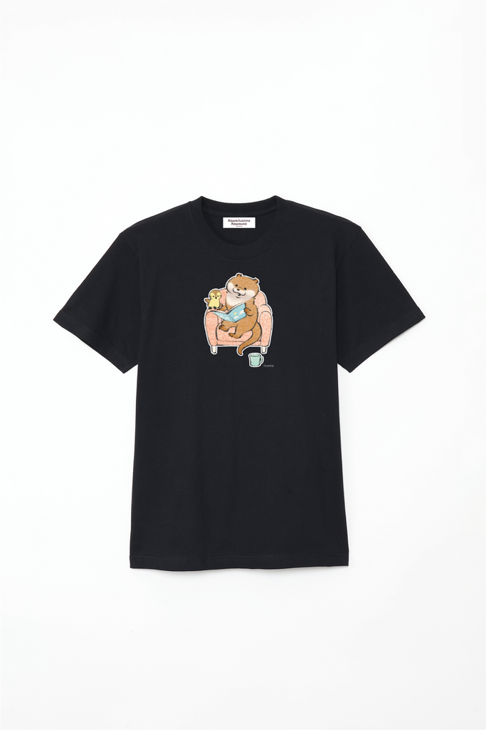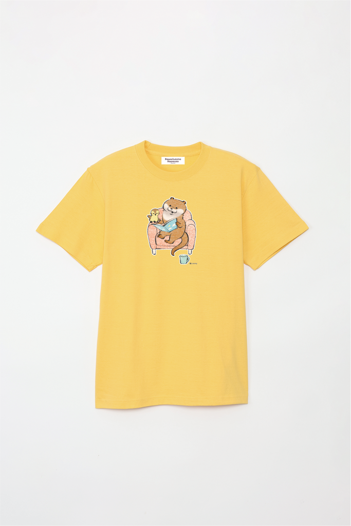 ソファで本を読むカワウソとカモちゃんの可愛いデザイン